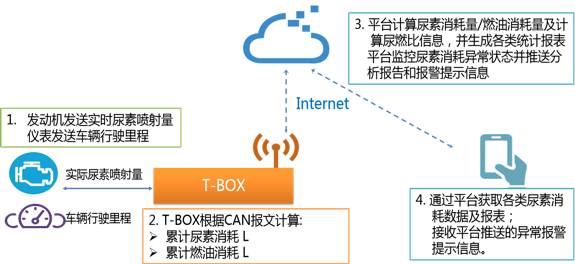 利用车联网通讯终端,车联网平台对尿素消耗量信息进行数据处理和分析。实现尿素异常情况报警和尿素异常问题分析排查,指导车辆维护。客户也可通过终端查询尿素数据。