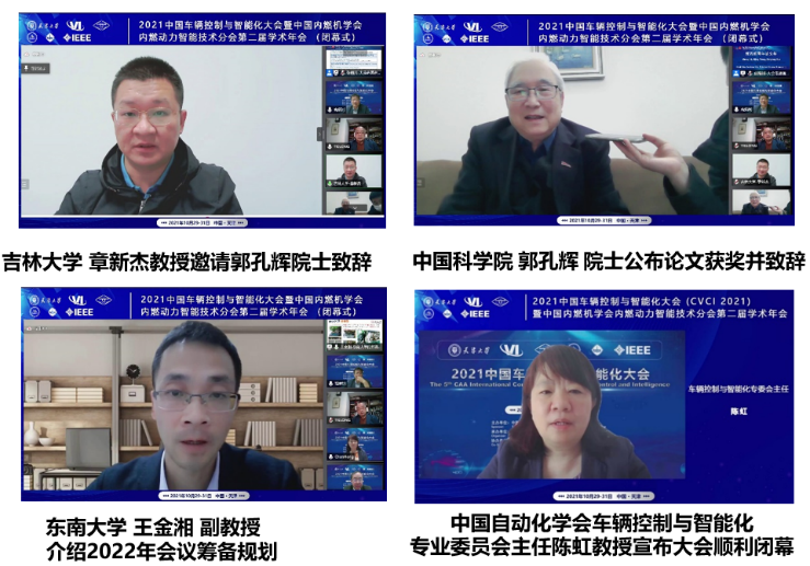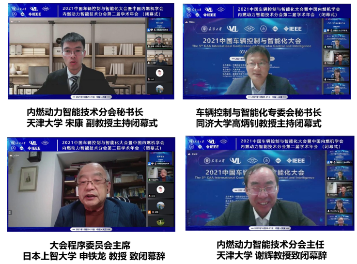 闭幕式由内燃动力智能技术分会秘书长、天津大学宋康副教授和车辆控制与智能化专委会秘书长、同济大学高炳钊教授共同主持。大会程序委员会主席、日本上智大学申铁龙教授和内燃动力智能技术分会主任谢辉教授分别致闭幕辞。大会副主席、天津大学左志强教授代表组委会总结了会议筹备和总体情况。高炳钊教授介绍了大会的论文投稿及录用情况,申铁龙教授和吉林大学章新杰教授公布了会议最佳论文提名及郭孔辉青年论文获得者,并邀请中国科学院郭孔辉院士致辞。下一届会议的承办方东南大学王金湘副教授介绍了2022年会议的承办规划。最后陈虹教授宣布大会胜利闭幕。