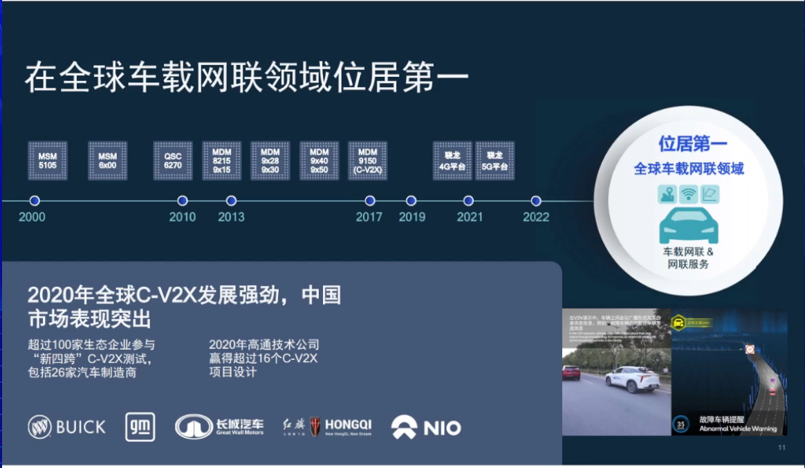 高通的解决方案C-V2X发展十分强劲,在中国市场表现突出,超过100家生态企业参与“新四跨” CV2X测试,包括26家汽车制造商。2020年高通技术公司赢得超过16个cV2X项目设计。位居全球车联网领域第一。