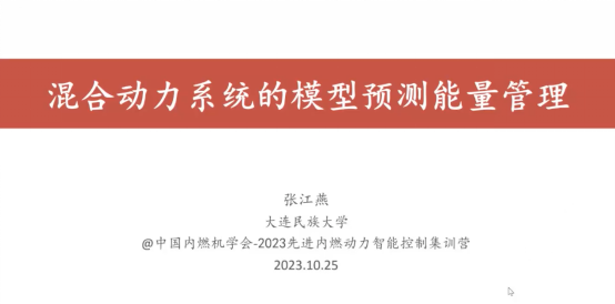 2023年10月25日,由中国内燃机学会主办,中国内燃机学会内燃动力智能技术分会、天津大学先进内燃动力全国重点实验室共同承办的先进内燃动力智能控制集训营(第六讲)顺利结束。来自大连民族大学的张江燕副教授受邀作线上报告,报告主题为 混合动力系统的模型预测能量管理。课程由内燃机学会内燃动力智能控制技术分会的秘书长宋康副教授主持。