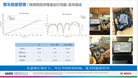 程老师通过仿真实验和实车测试,展示了预测性绿波出行功能在不同工况下的表现。结果显示,在仿真测试条件下,具备该功能的车辆相较于普通驾驶风格,在相同时间内能节约能耗约3.6%,而在相同能耗下,预计能节约时间约5%。实车测试进一步证实了该功能的有效性,在虚拟红绿灯下,具备预测性绿波出行功能的车辆可以节约时间约9%,或节约能耗约7%。